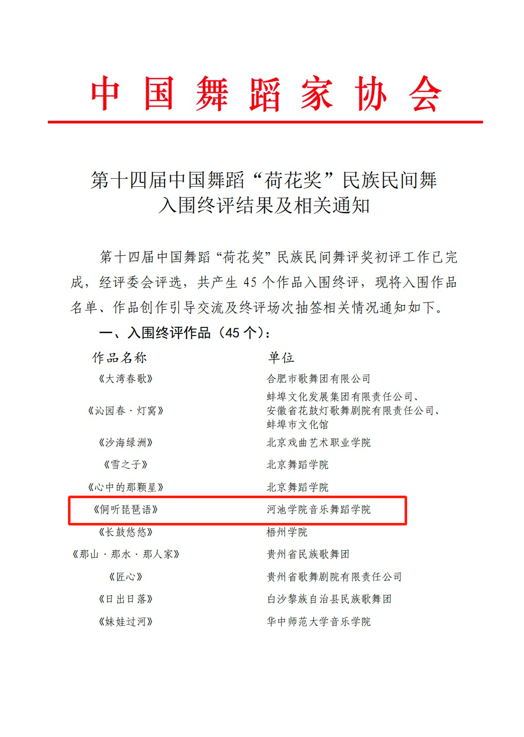 近日,第十四届中国舞蹈“荷花奖”民族民间舞评奖公布了45个入围终评作品名单,bat365音乐舞蹈学院原创舞蹈作品《侗听琵琶语》成功入选终评作品名单中。这是bat365舞蹈学专业建设的一个重大突破,具有非凡的里程碑意义。