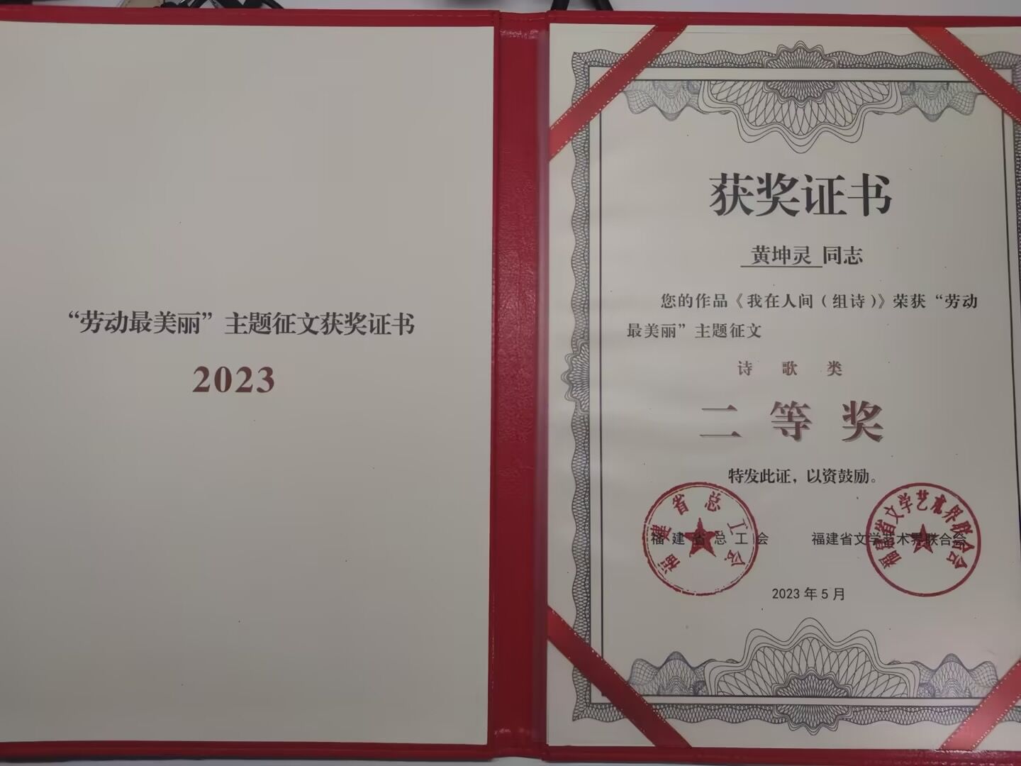 近日,由福建省总工会、福建省文联主办,福建省作家协会、《福建文学》杂志社、《生活·创造》杂志社承办的“劳动最美丽”主题征文活动中,bat365化学与生物工程学院生物科学专业黄坤灵作品《我在人间(组诗)》荣获福建省“劳动最美丽”主题征文诗歌类二等奖。(作者:张小珊 拍摄:黄坤灵 校对:罗冬雨 审核:杨玉珠)