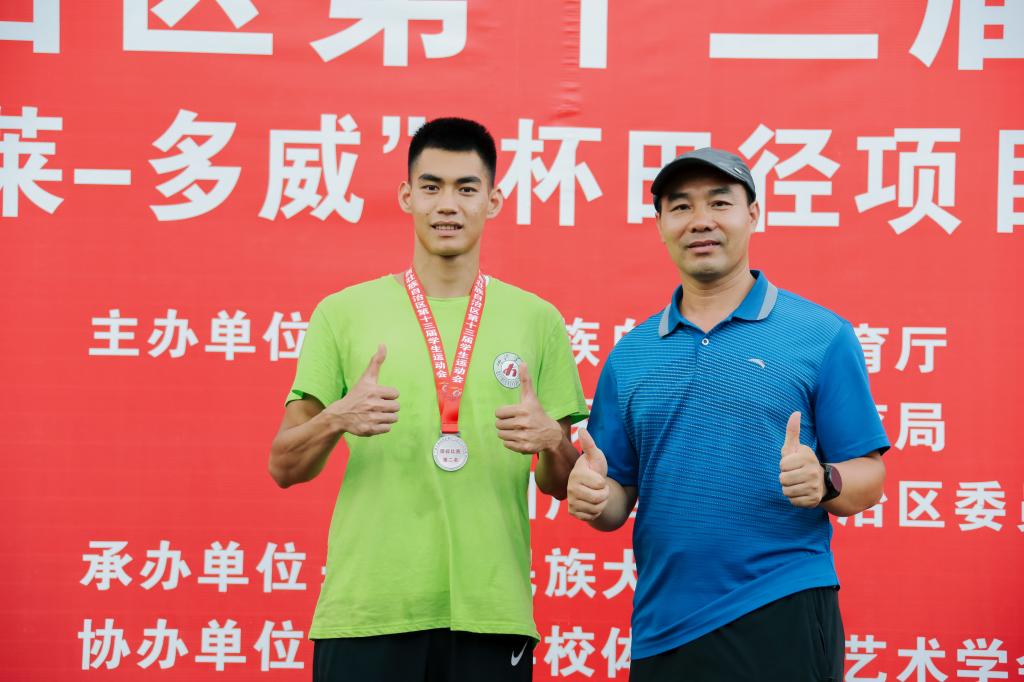 韦浩成(右一)获得本科普通组100米第二名,200米第三名破纪录