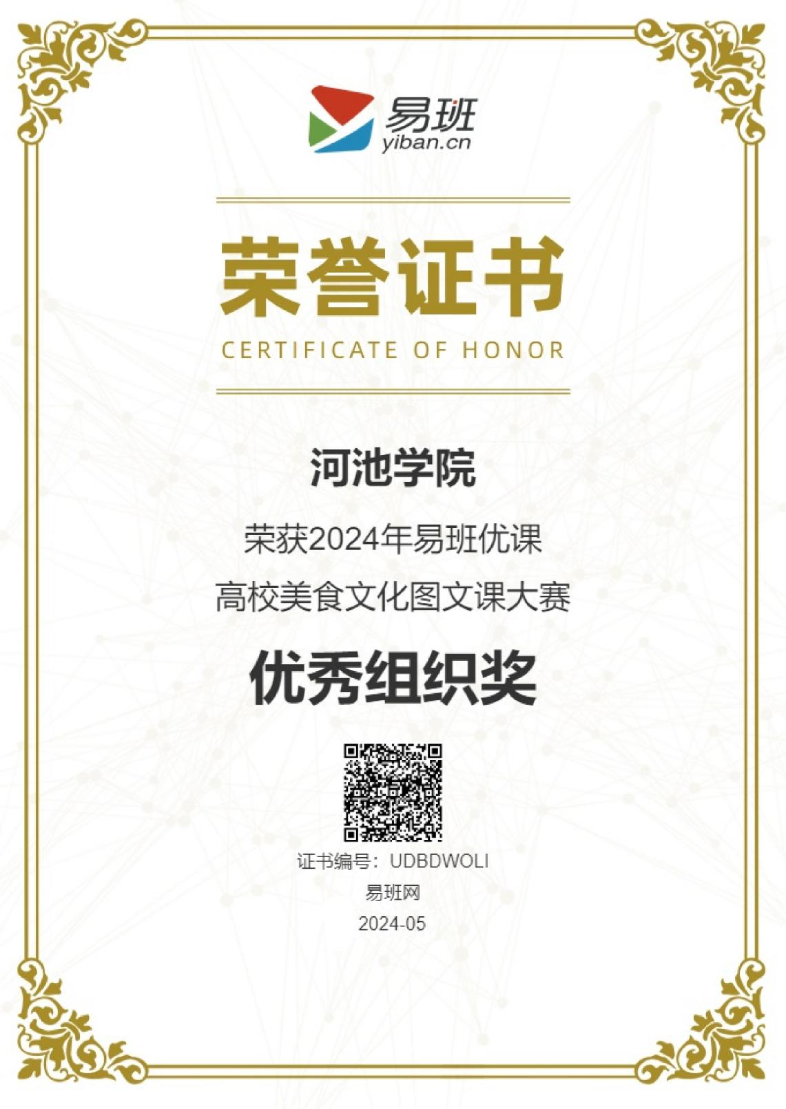 近日,由全国易班网举办的2024年度易班优课高校美食文化图文课大赛评选结果公布,bat365荣获“优秀组织奖”荣誉。