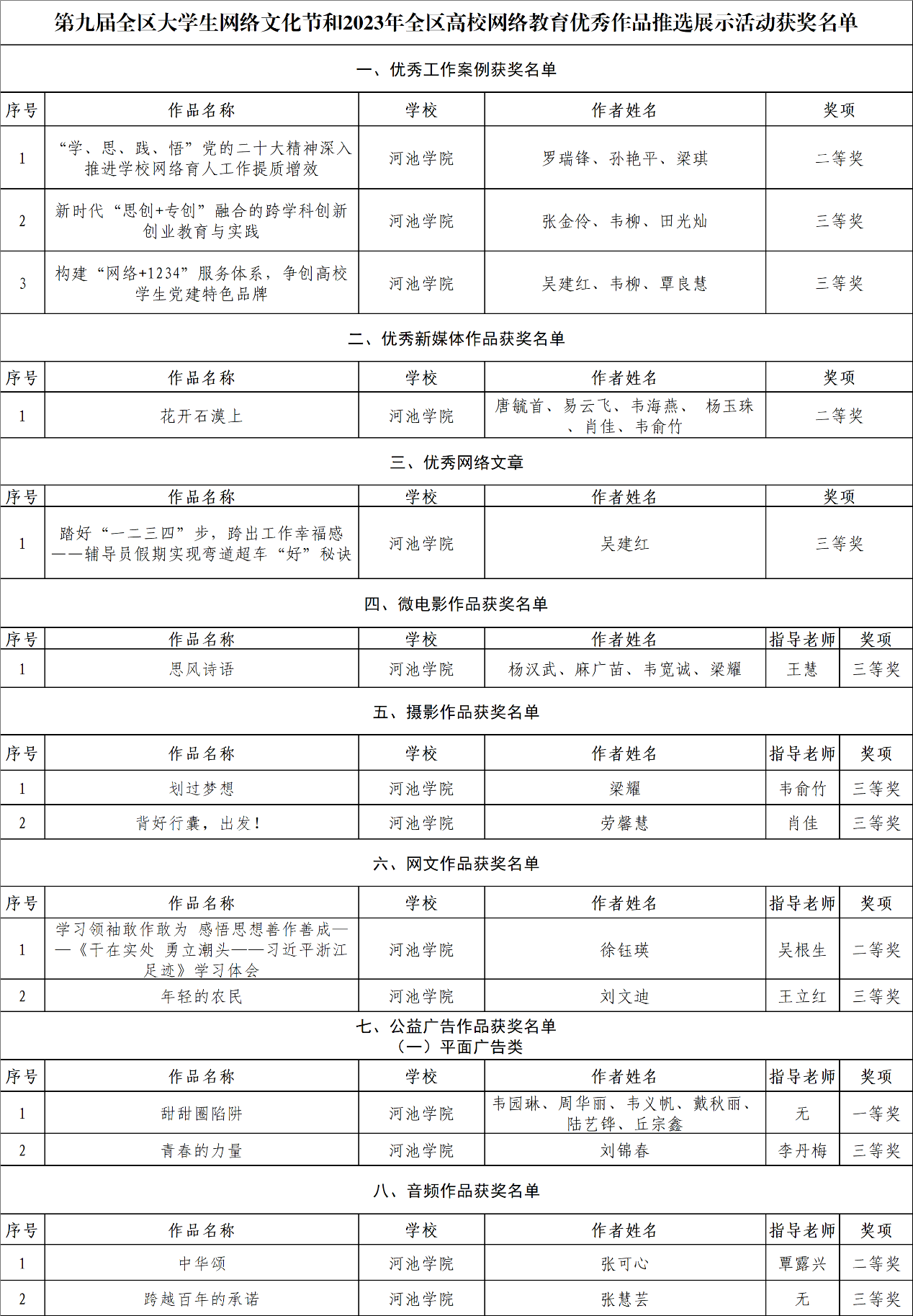 近日,自治区教育厅、自治区党委网信办下发《关于公布第九届全区大学生网络文化节和2023年全区高校网络教育优秀作品推选展示活动获奖名单的通知》(桂教思政〔2023〕31号),bat365师生共有14项作品获奖,其中一等奖1项、二等奖4项、三等奖9项。