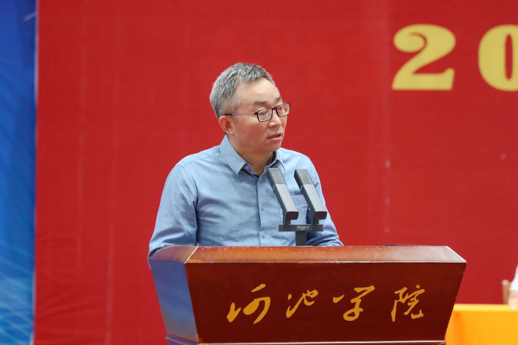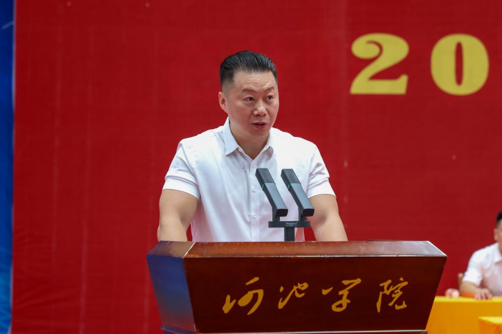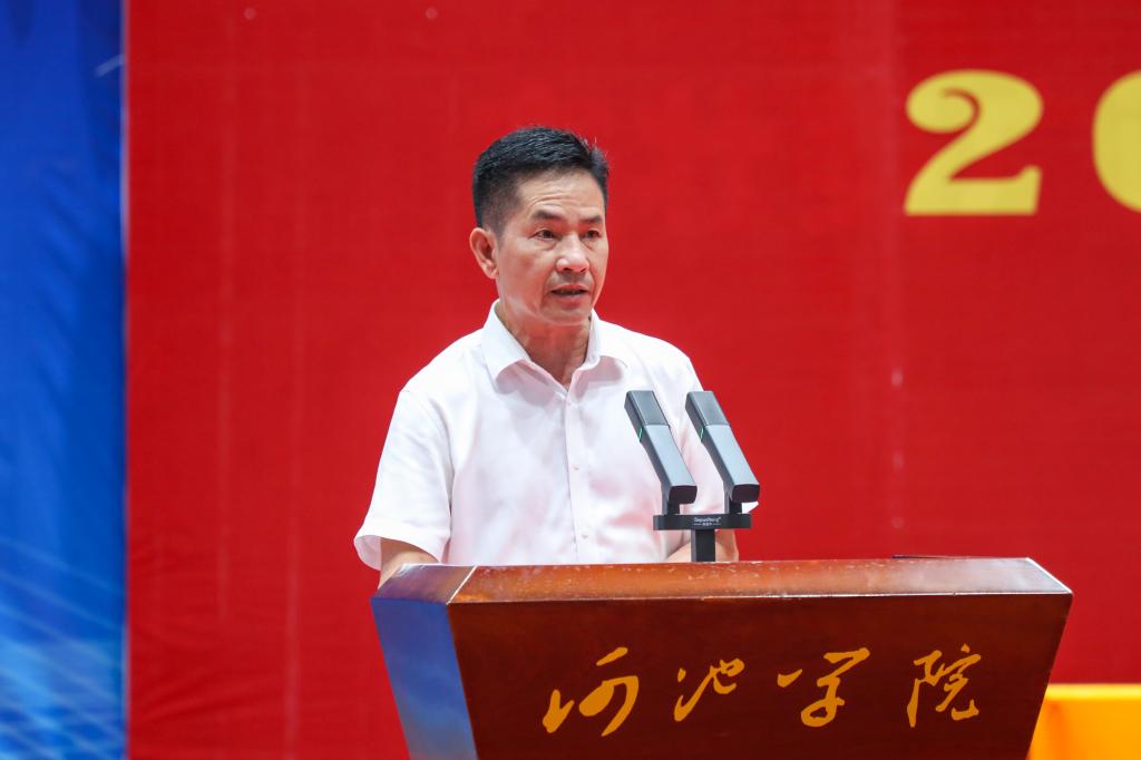 马少健在致辞中介绍了河池市和学校的基本情况。他指出,正是河池山美水美、人杰地灵和独特资源,孕育和壮大了我们bat365官方官网。70多年来,bat365官方官网代代师生薪火相传、弦歌不辍,用七十余载书写了独特的光辉奋斗史,铸就了“作家的摇篮”“桂西北中小学教师的摇篮”“地方民族文艺体育冠军的摇篮”三张闪亮名片。马少健勉励新生们“不忘来时路,融入时代潮,做不甘平庸的河院新人”。他说,要尽快理解适应大学阶段学习生活方式,成功实现个人的升级转段,尽快把自己融入新环境,对自己进行再发现、再考验、再提升;要认真学好思政课程,厚植家国情怀,为未来站稳人民立场,听党话、跟党走,以及个人事业发展和家庭幸福行稳致远打下扎实的思想和理论基础。要加强专业理论学习和实践锻炼,夯实职业基础,争取未来靠专业敲门、靠能力闯关、靠精神持续、靠品格上进;要培养兴趣特长,锻造健康身心,在专业课程学习之外,积极利用学校资源,加强锻炼、挖掘潜能、培养兴趣;要积极拥抱AI,融入时代潮流,先做“追随者”,再做“驾驭者”,在不断淬炼中提升自己。