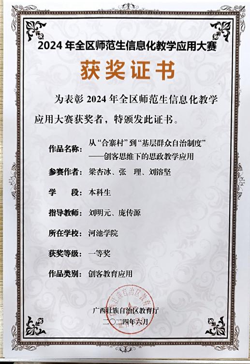 (一)思政课建设迈上新台阶。党对思政课建设的领导全面加强,学校社会主义办学方向更加鲜明,思政课教师乐教善教、潜心育人的信心底气更足,大学生“四个自信”明显增强、精神面貌奋发昂扬,思政课发展环境和整体生态发生全局性、根本性转变。马院积极推进思政课教学改革创新,取得一批成果。2021年江洪明教授等主持完成的《高校思政课“十时五度五点”教学模式探索与创新》获广西高等教育自治区级教学成果二等奖。2022年罗昌勤教授等负责的“毛泽东思想和中国特色社会主义理论体系概论”获得自治区级一流本科课程。4名教师入选全区思想政治教育卓越人才支持计划。多位中青年教师获得广西思政课“精彩一课”“广西青年教师教学竞赛”等省部级教学奖。2024年马院提出的“12363”铸魂育人模式,得到区教育厅思政课教学巡察组的好评。在区教育厅开展的“习近平新时代中国特色社会主义思想大学习领航计划2023年系列主题活动”中,获得大学生讲思政课公开课展示活动三等奖3项,获得大学生微电影展示活动二等奖1项、三等奖1项。在教育厅举办的“我心中的思政课”——2024年广西高校大学生微电影展示活动中,获二等奖1项、三等奖2项。思政课教学资源建设取得新成效。譬如:牙远波教授主持的教育部课题组建立了“中国近现代史纲要”资源库。大中小学思政课一体化建设和“大思政课”建设呈现新亮点。2024年4月推动成立河池市大中小学思政课一体化建设指导委员会,马院3名教师入选专家委员会委员。《学习宣传贯彻党的二十大精神,大力弘扬中国共产党人精神谱系》在《广西日报》2023年1月10日第11版发表,中国网转载;《精教深研真学实干——bat365官方官网马克思主义学院新时代劳动教育综述》在《广西日报》2023年2月6日第7版发表,新浪网转载;《坚持学、思、用贯通 扎实推进“大思政课”建设》,在《广西日报》2023年7月4日第8版发表。在2024年全区高校“大思政课”教学改革优秀工作案例征集活动中,获得二等奖1项。