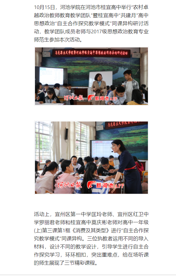 10-172019【河池日报】bat365官方官网组织的这场活动刷新认识,原来高中思想政治课还能这样上10月15日,bat365官方官网在河池市桂宜高中举行“农村卓越政治教师教育教学团队”暨桂宜高中“共建月”高中思想政治“自主合作探究教学模式”同课异构研讨活动,教学团队成员老师与2017级思想政治教育专业师范生参加本次活动。活动上,宜州区第一中学匡玲老师、宜州区红卫中学罗丽君老师和桂宜高中莫庆彬老师对高中一年级(上)第三课第1框《消费及其类型》进行“自主合作探究教学模式”同课异构。三位执教者运用不同的导入材料,设计不...