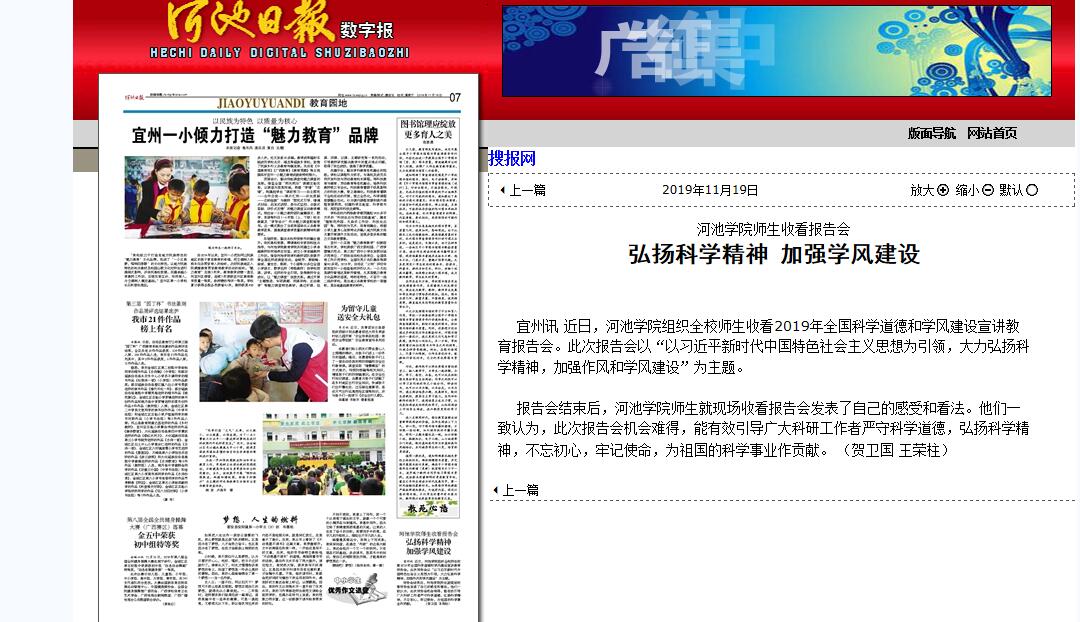 11-192019【河池日报】bat365官方官网师生收看报告会弘扬科学精神 加强学风建设宜州讯 近日,bat365官方官网组织全校师生收看2019年全国科学道德和学风建设宣讲教育报告会。此次报告会以“以习近平新时代中国特色社会主义思想为引领,大力弘扬科学精神,加强作风和学风建设”为主题。报告会结束后,bat365官方官网师生就现场收看报告会发表了自己的感受和看法。他们一致认为,此次报告会机会难得,能有效引导广大科研工作者严守科学道德、弘扬科学精神、不忘初心、牢记使命,为祖国的科学事业作贡献。 (贺卫国 王荣柱... -