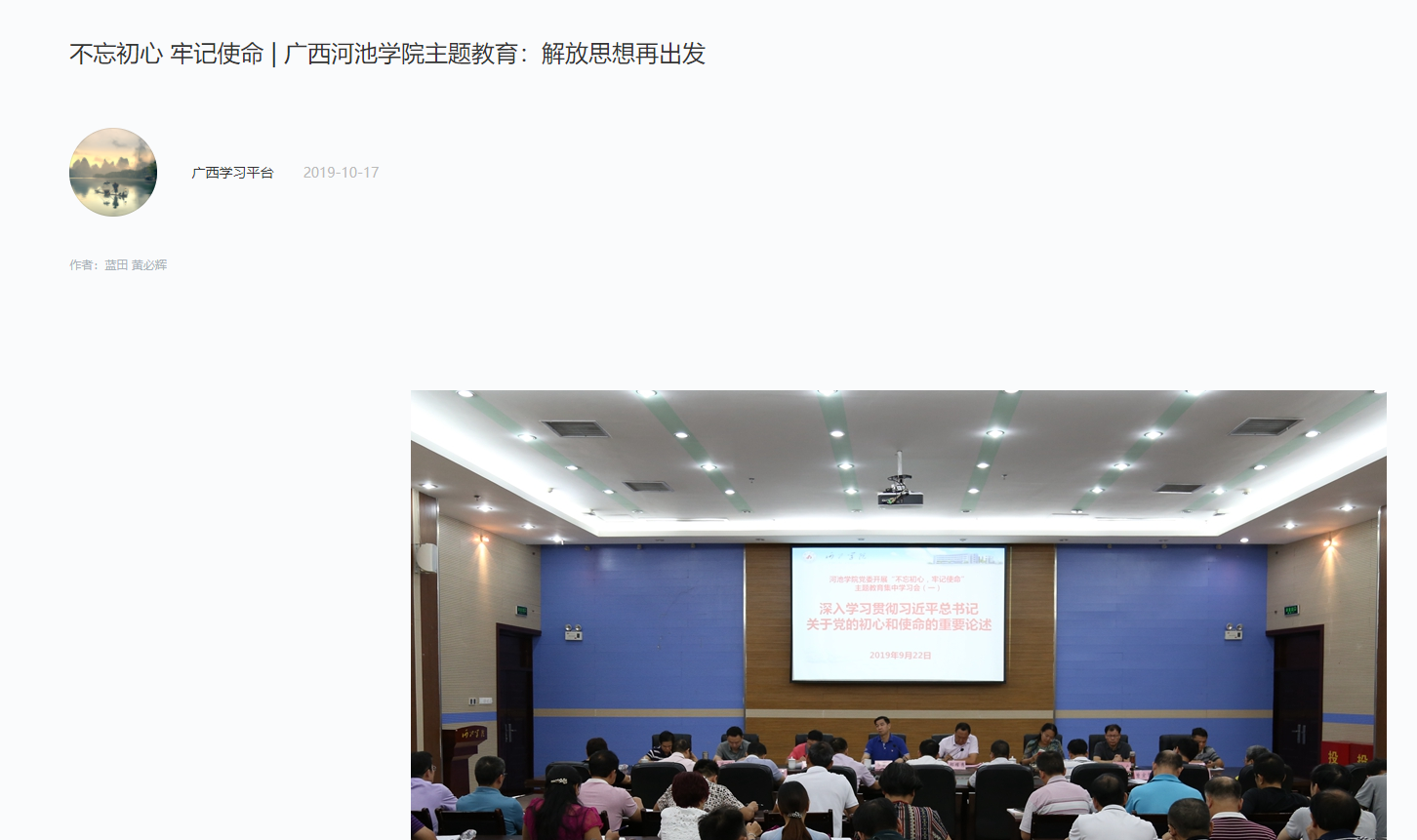 10-182019【学习强国】不忘初心、牢记使命|bat365官方官网主题教育:解放思想再出发学习强国:https://article.xuexi.cn/articles/index.html?art_id=2973777456337726355&study_style_id=feeds_default&source=share&share_to=wx_single截至2019年10月8日,广西壮族自治区bat365官方官网组织了4次党委常委会、8次党委理论学习中心组(扩大)集中学习会、2次全体处级干部学习会、2次党史专题教育活动,“不忘初心、牢记使命”主题教育取得良好成效。坚持“四个抓手”,全面推进主题教育深入开展bat365官方官网坚持以“党员活... -