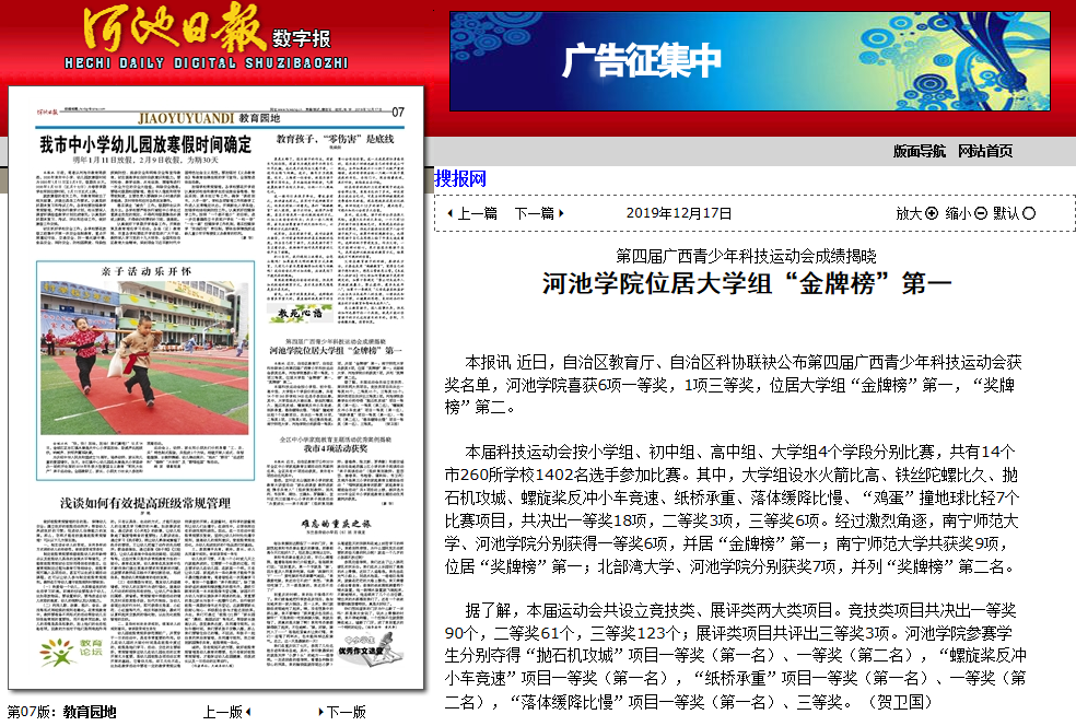 12-172019【河池日报】第四届广西青少年科技运动会成绩揭晓 bat365官方官网位居大学组“金牌榜”第一河池日报:http://hcrb.hcwang.cn/html/2019-12/17/content_203538.htm本报讯 近日,自治区教育厅、自治区科协联袂公布第四届广西青少年科技运动会获奖名单,bat365官方官网喜获6项一等奖,1项三等奖,位居大学组“金牌榜”第一,“奖牌榜”第二。本届科技运动会按小学组、初中组、高中组、大学组4个学段分别比赛,共有14个市260所学校1402名选手参加比赛。其中,大学组设水火箭比高、铁丝陀螺比久、抛石机攻城、螺旋桨反冲小车竞速、... -
