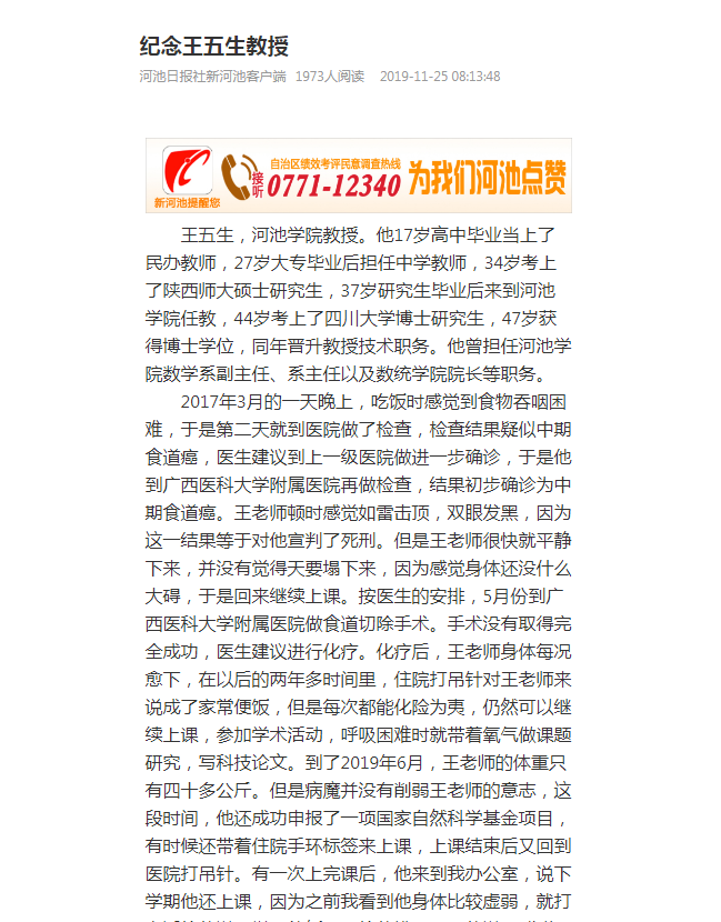 12-052019【新河池客户端】纪念王五生教授新河池客户端:https://h5.newaircloud.com/detailArticle/9653126_20738_hcrb.html?app=1王五生,bat365官方官网教授。他17岁高中毕业当上了民办教师,27岁大专毕业后担任中学教师,34岁考上了陕西师大硕士研究生,37岁研究生毕业后来到bat365官方官网任教,44岁考上了四川大学博士研究生,47岁获得博士学位,同年晋升教授技术职务。他曾担任bat365官方官网数学系副主任、系主任以及数统学院院长等职务。2017年3月的一天晚上,吃饭时感觉到...