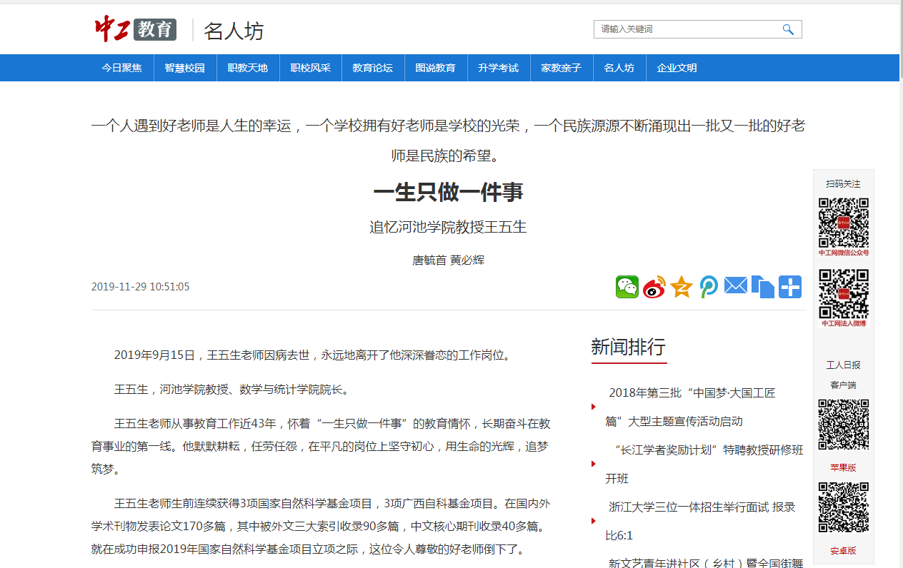 12-052019【中工教育】一生只做一件事——追忆bat365官方官网教授王五生纪念王五生教授2019年9月15日,王五生老师因病去世,永远地离开了他深深眷恋的工作岗位。王五生,bat365官方官网教授、数学与统计学院院长。王五生老师从事教育工作近43年,怀着“一生只做一件事”的教育情怀,长期奋斗在教育事业的第一线。他默默耕耘,任劳任怨,在平凡的岗位上坚守初心,用生命的光辉,追梦筑梦。王五生老师生前连续获得3项国家自然科学基金项目,3项广西自科基金项目。在国内外学术刊物发表论文170多篇,其中被外文三大索引收录9... -